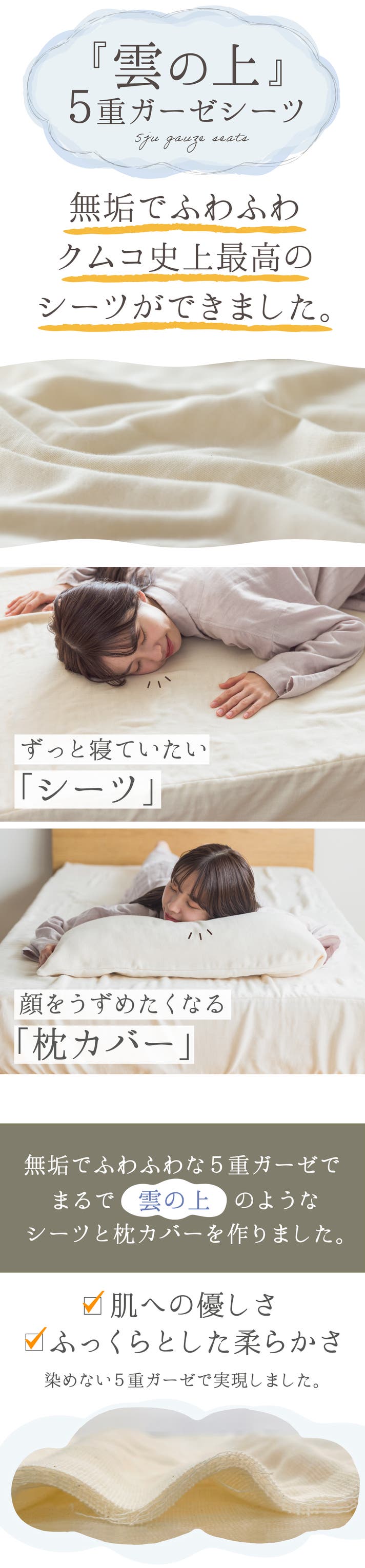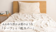 ふっくらボリュームのある5重ガーゼに、お湯で洗っただけのシンプルな加工を施したら、無垢でふわふわな『雲の上』のシーツと枕カバーができました。