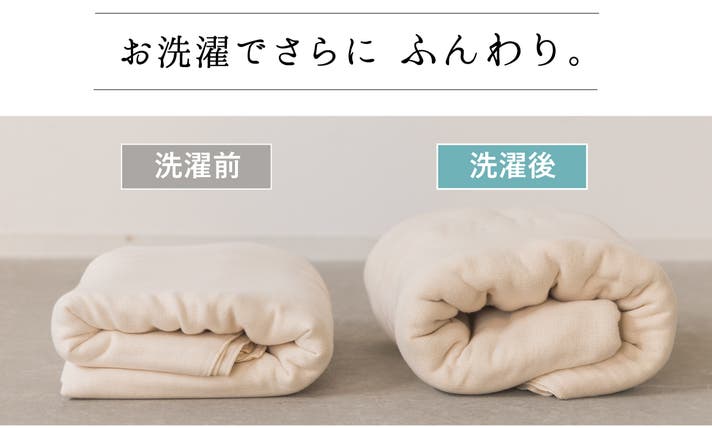 お洗濯をすることで、さらに柔らかくふんわりとします。使い込むほどガーゼならではの風合いが出て、肌に馴染んでいきます。ボリュームもアップしてぬくもりもアップします。