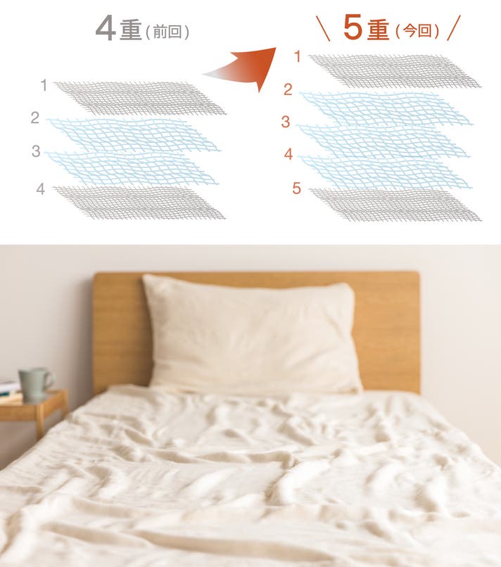 前回の4重からさらに1枚増えて5重になり、柔らかさや寝心地がアップしました!