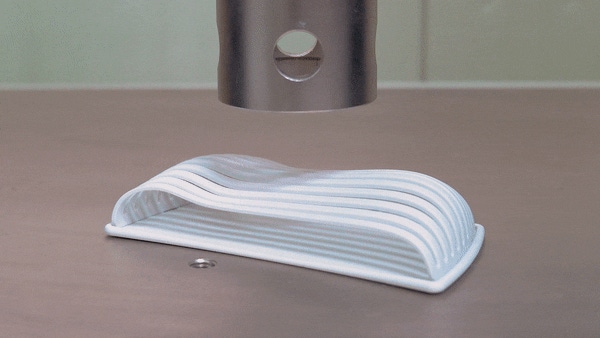 手首を支えるマウスパッドは様々ありますが、一般的なウレタン素材などは圧縮され時間が経つと硬く感じたりもします。そこでカーブルマウスパッドはアーチ状のサポートラインを変形させて手首への圧力を吸収する構造を開発しました。
