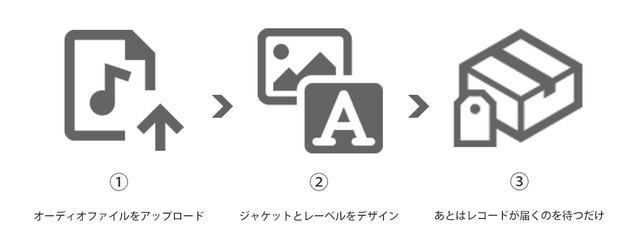 まずはあなたの音源のオーディオファイルをアップロードします。次に画像やテキストを入れてジャケットとセンターレーベルをデザインするだけで入稿は完了。お届け先の住所を入力すれば、あとはレコードが届くのを待つだけ。レコードの発送はご入稿が完了してから10営業日後を予定しています。