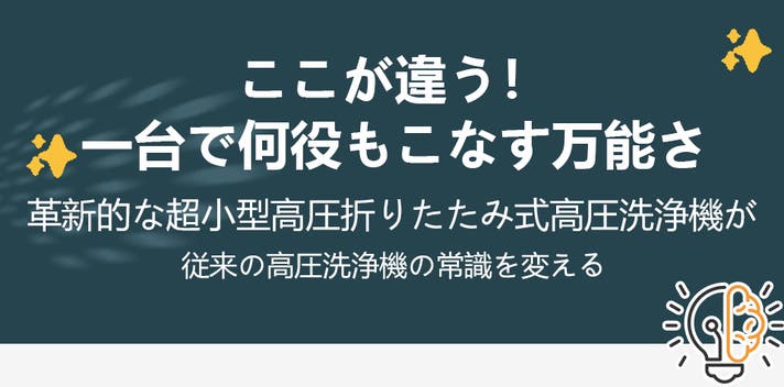 「Makuake(マクアケ)」は、実行者の想いを応援購入によって実現するアタラシイものやサービスのプラットフォームです。このページは、 プロダクトカテゴリの 「【超小型で軽量】折りたたみ式の高圧洗浄機 |コードレスで給水が自由自在|高圧洗浄」プロジェクト詳細ページです。