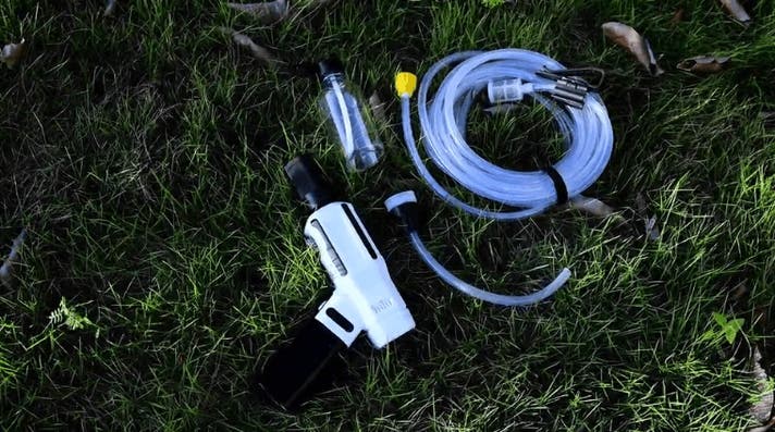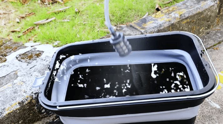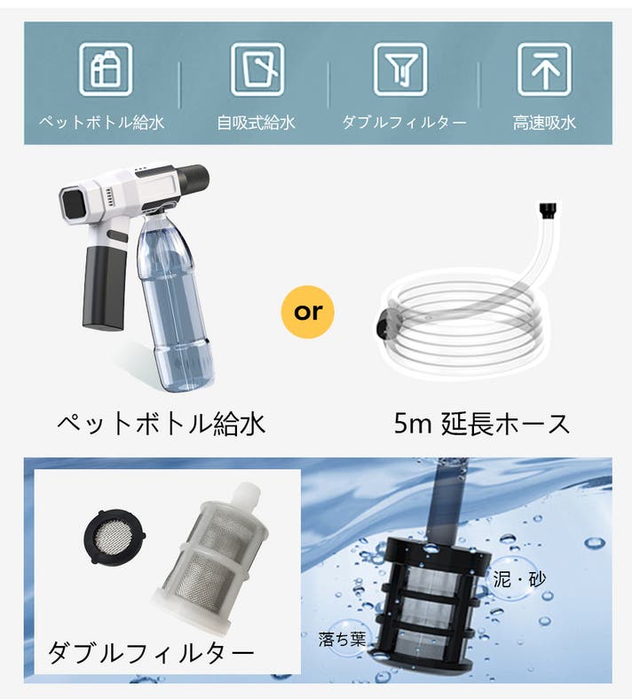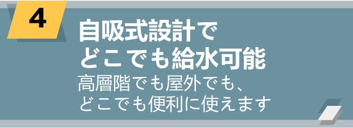 バケツやペットボトル、蛇口からも給水できるため、家でもアウトドアでも、水さえあればすぐに洗浄できます。