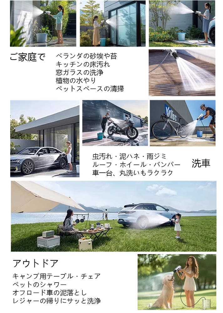 生活雑貨からアウトドア用品まで、さまざまな清掃シーンに手軽に対応。節水しながらもしっかり洗えて、効率も抜群です。