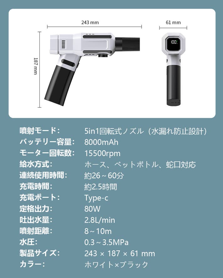 1回のフル充電で、「洗車+お庭+ベランダ」をまとめてキレイに。 バッテリー残量を気にせず使えるので、掃除がもっと気楽に。 Type-C対応なので、スマホの充電器をそのまま使えます。