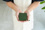 右:新作「Cubetto(クベット)」は正方形95mmのキューブ型。カードは立てて視認でき、小銭は大きく開くボックス型。すべて同じ向きで出し入れできるように設計しました。