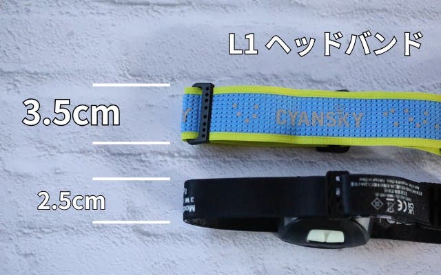 一般的なヘッドライトのヘッドバンドは2~2.5cm幅のものが多い中、L1のヘッドバンドは3.5cmと幅広い。頭部の締め付け感を軽減。