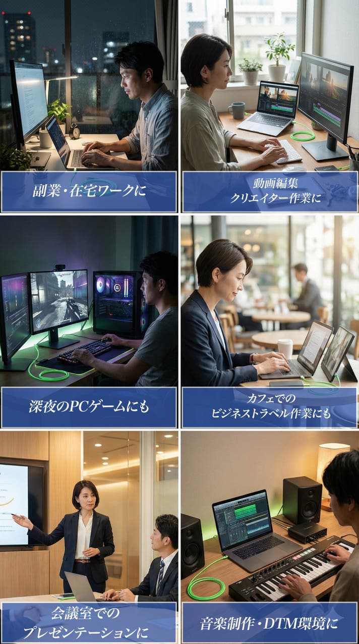 CyberCableがあるだけで、そこは「未来のワークスペース」に変わります。 機能性だけじゃない。所有する喜びを満たす、具体的な利用シーンをご覧ください。