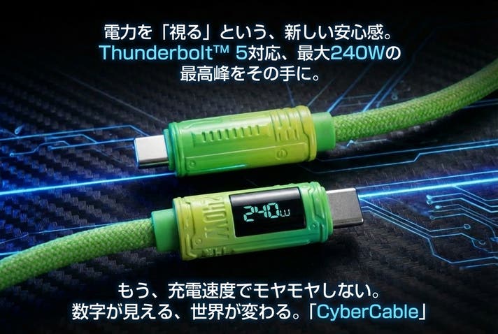 - 電力表示ディスプレイ搭載。蛍光グリーンが映えるCyberCable。