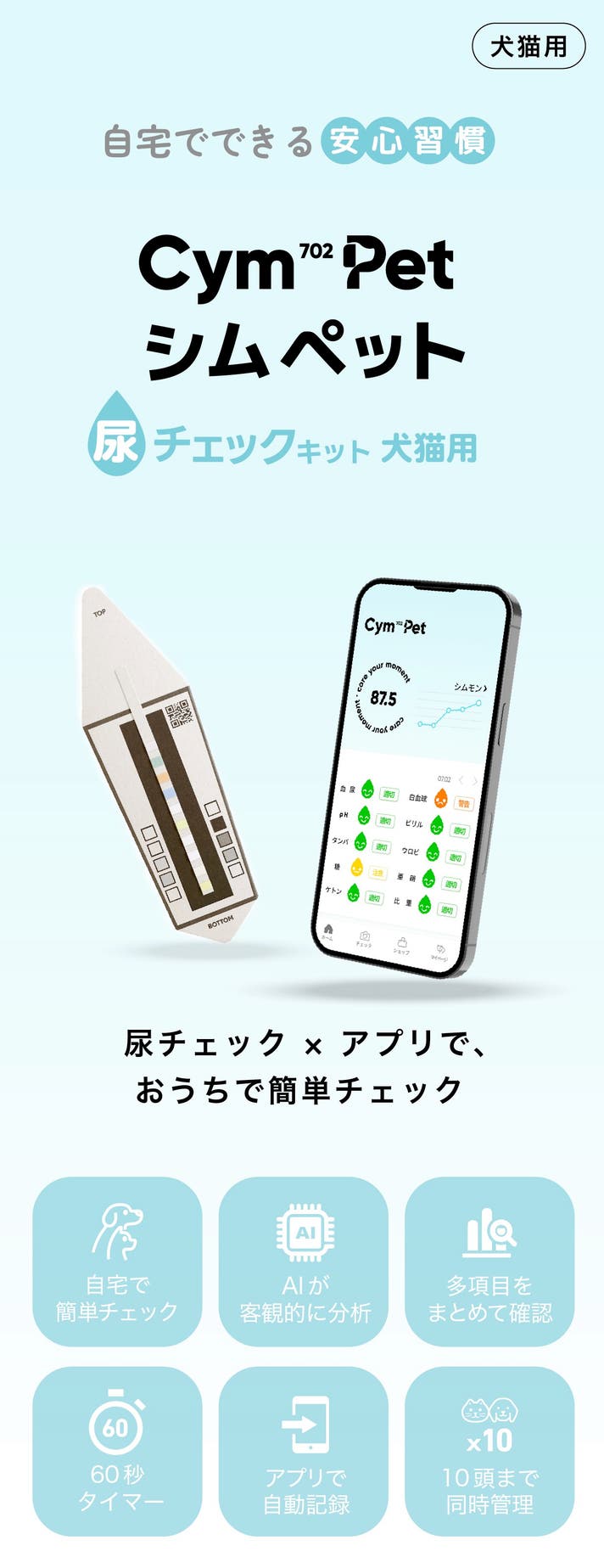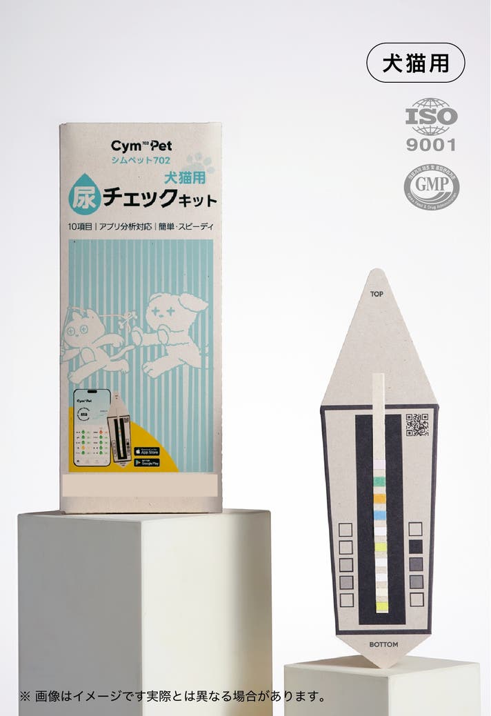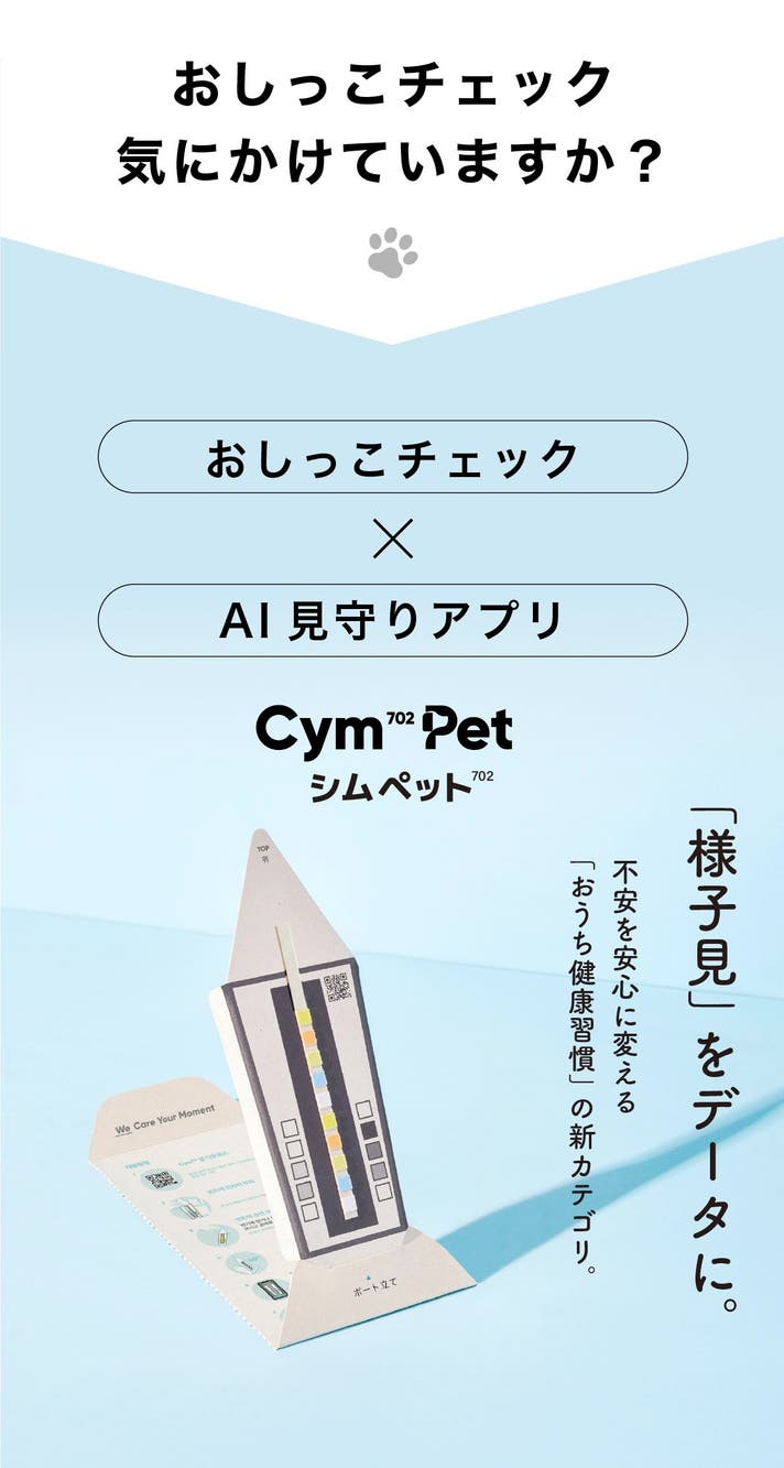 シムペット(Cym702Pet)なら、自宅で手軽に尿検査を行い、毎日の健康傾向をスマホで数値化。「うちの子にムリをさせずに、ちゃんと見守りたい」という飼い主さん向けに設計しています。