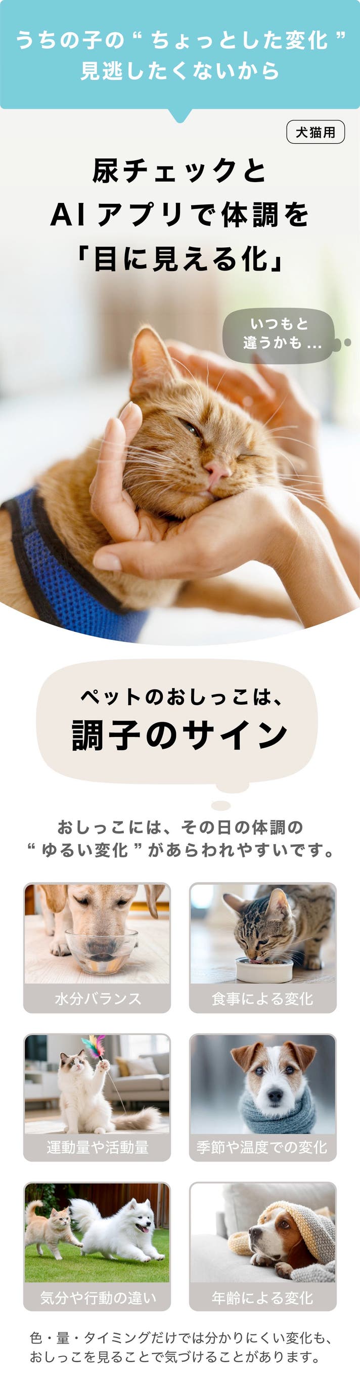 - 【やさしい】AIが多面的な変化のヒントを解析し、 シニア犬猫の日々の健康管理をそっとサポート。