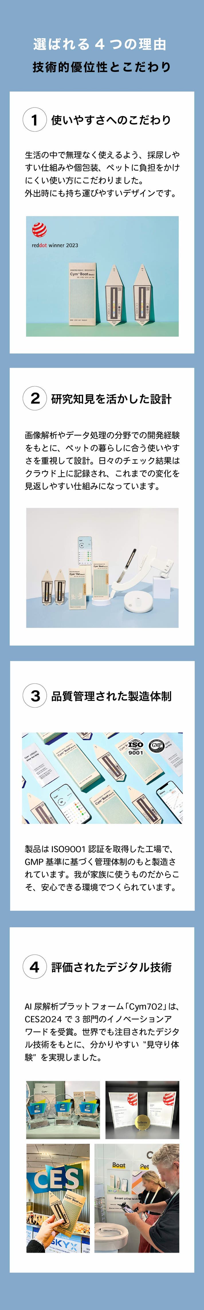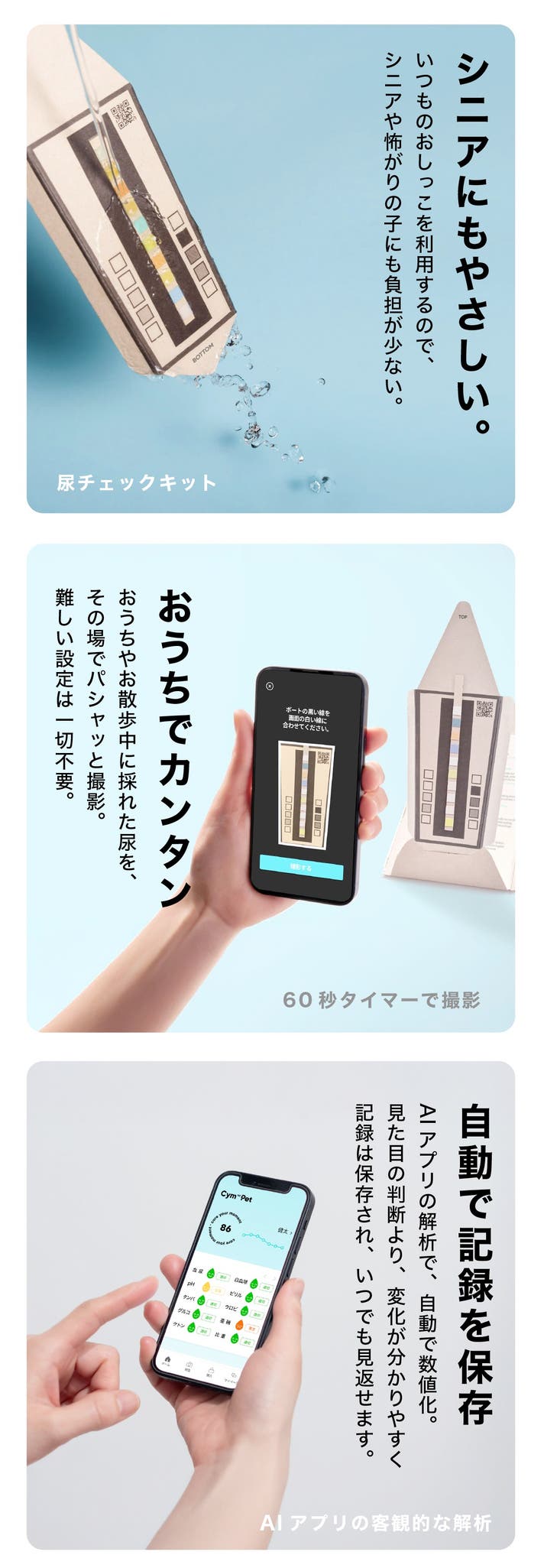 Cym702 Petは、この技術をペットとの暮らしに寄り添う形で進化させたモデル。おしっこを撮影するだけのシンプルさと、日々の違いに気づきやすくする解析を組み合わせました。