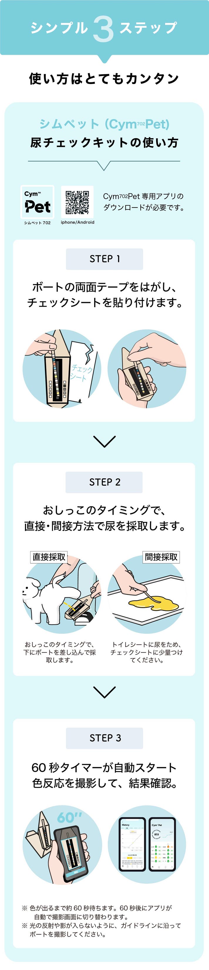A. 専用シートは、尿が触れると化学反応が進んで色が変わり一定時間を過ぎると、さらに色が濃くなる・変色するなどで正確性が落ちるため、「反応後60秒で読み取る」ように設計されています。約60秒待ってから撮影することで、毎回ほぼ同じタイミングの色の状態を残すことができ、記録を続けたときに「以前と比べてどうか」を見比べやすくなります。ということで、記録の条件をそろえるための目安として「60秒」をお願いしています。