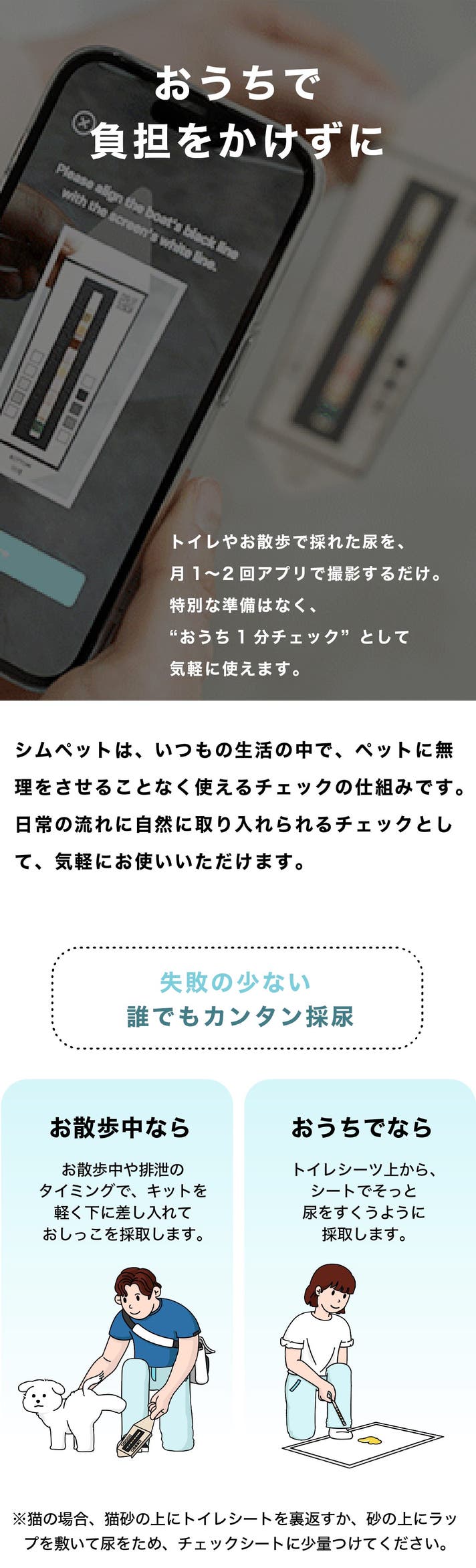 シンプルなおしっこ検査+AIアプリで、うちの子のようすや日々の健康をチェックできます。