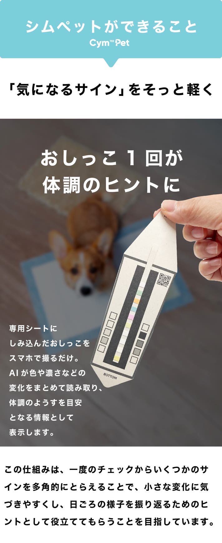 A. シムペットは、ペットのおしっこを専用シートにしみこませ、その色のようすをスマートフォンで撮影・記録しておくための「ペット用ヘルスケア雑貨」です。