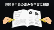 - 本の見開き中央の歪みを自動で補正。分厚い書籍も裁断不要で高速スキャン!