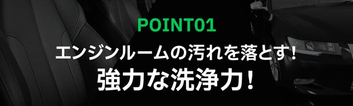 エンジンルームにこびりついた黒ずみやオイル汚れ。 通常の洗剤では落としにくいこれらの汚れに対応するために必要なアルカリ性成分を配合しました!