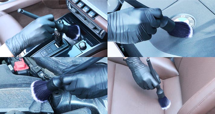 エンジンルームのすき間やハンドル周辺のスイッチ、エアコン吹き出し口など細かい部分にはディテイリングブラシでお掃除!