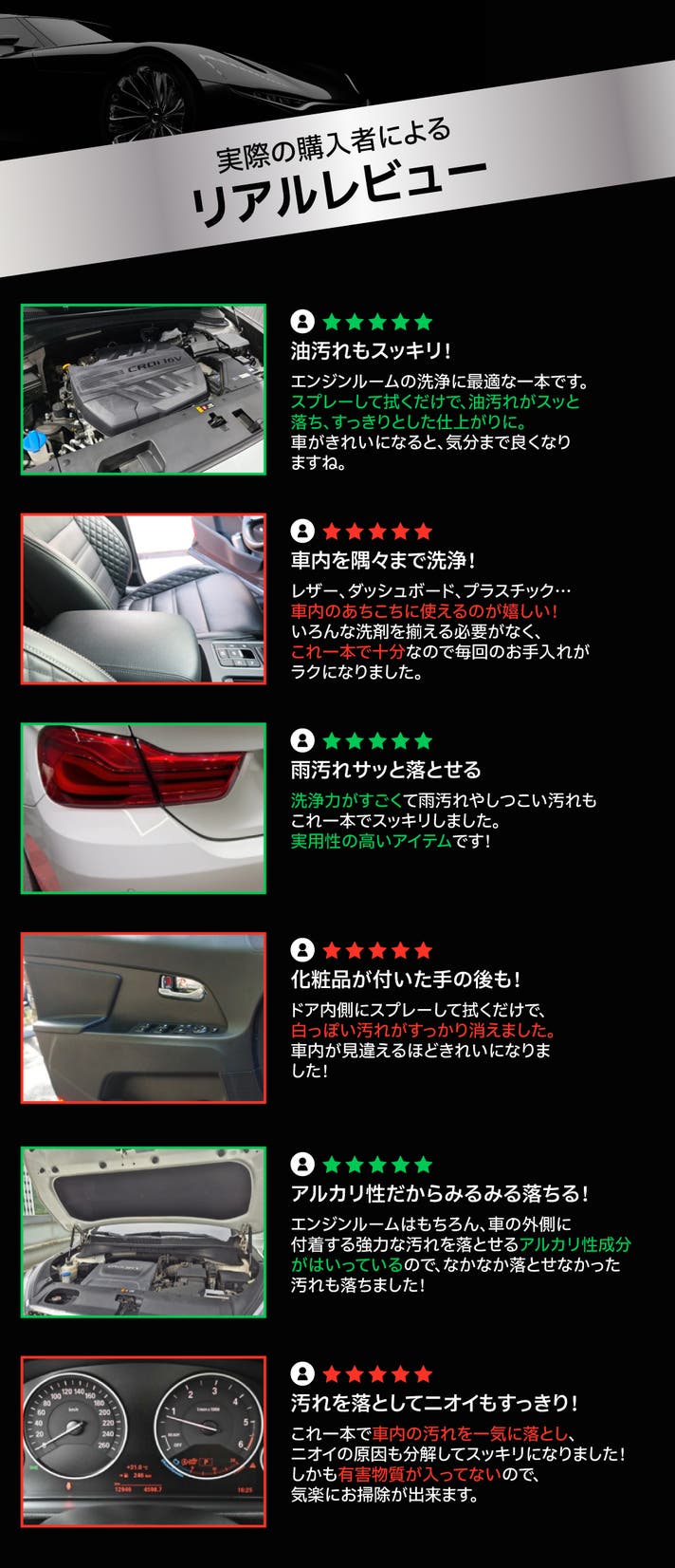 - アルカリ性成分配合でエンジン周りの油・カーボン汚れを一掃!エンジンルームに特化された洗浄剤!