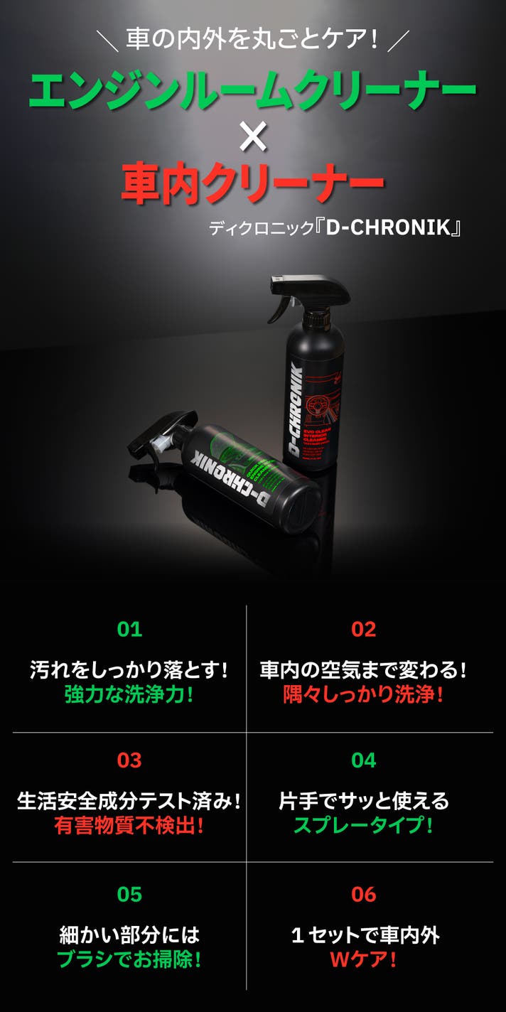 ディクロニックのエンジンルームクリーナーと車内クリーナーは、韓国の公的認証機関により、有害物質が検出されないことが確認されています。 安心して使える生活安全認証を取得しているため、車内外で安心してお使いいただけます!