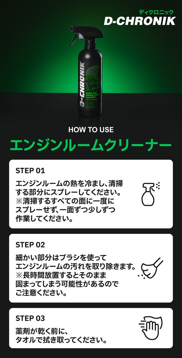 エンジンルームクリーナーも車内クリーナーも、スプレーして拭くだけのシンプル設計です。 ボトルを開けて混ぜたりする手間、一切なし!