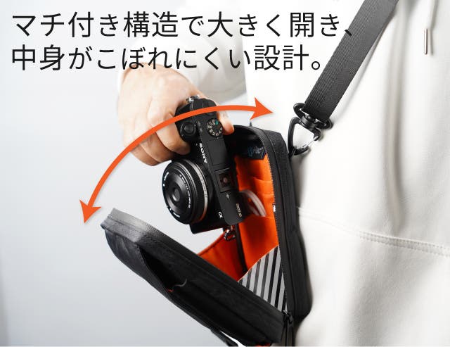 A:スマホ・ミニ財布・鍵・イヤホン・カード類など、日常の必需品をすべて収納できます。さらにメインコンパートメントは開口が広く、コンパクトデジカメも収納可能です。