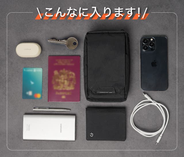 例えば、スマホ、二つ折り財布、モバイルバッテリー、イヤホン、パスポート、ケーブル、カード、ペン、鍵など、必要なアイテムをしっかり収納可能。