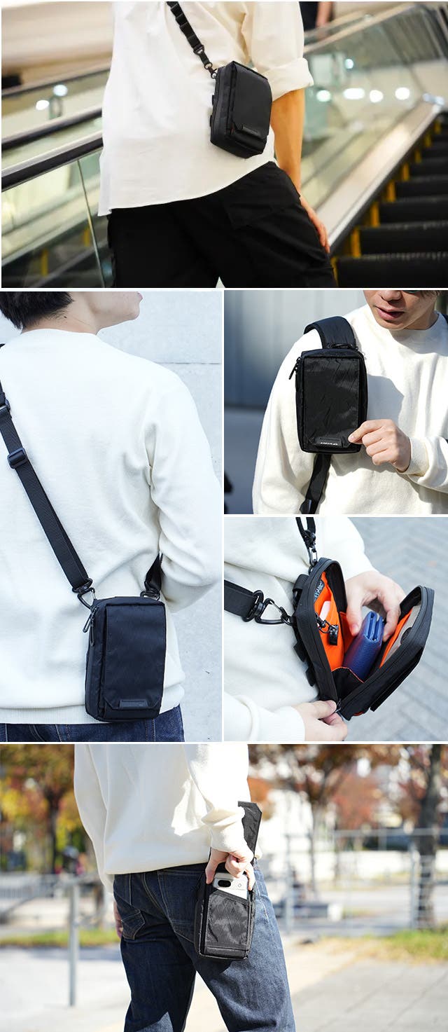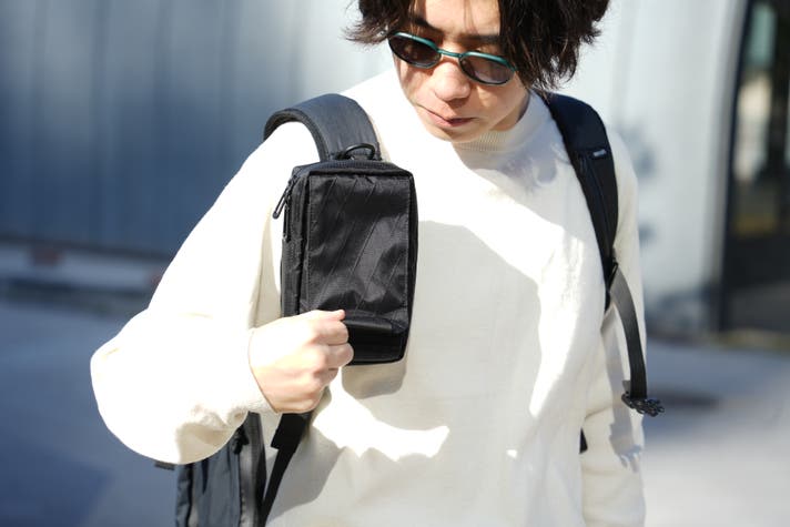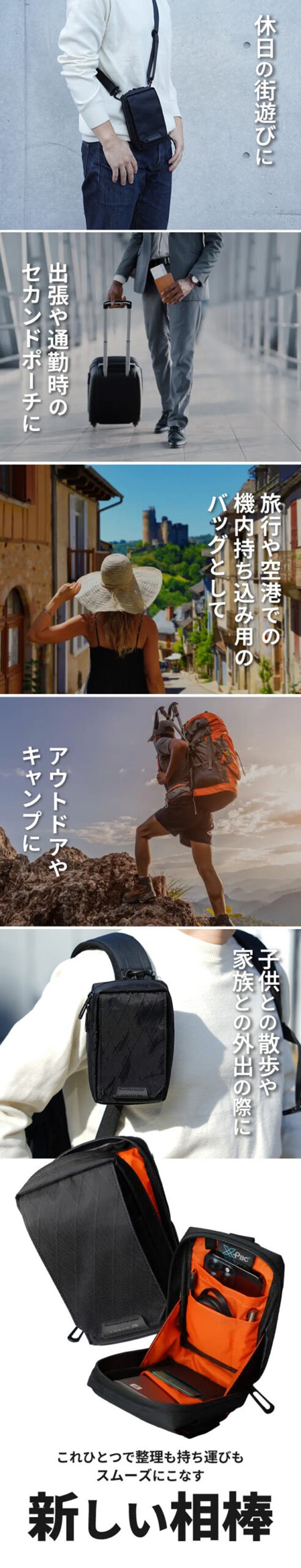 A:通勤・出張・旅行・カフェ作業・休日の外出など、ほぼすべてのシーンに対応します。また、リュックやショルダーに接続してサブポーチとしても活躍。ポケット以上、バッグ未満のサイズです。