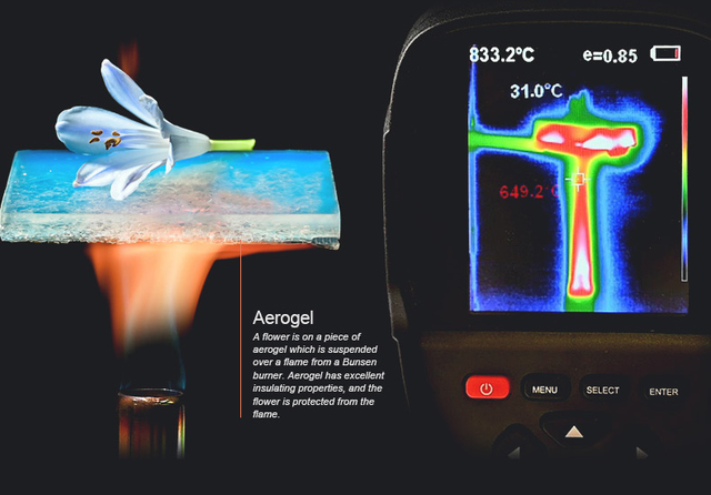 エアロゲルは断熱性にとても優れた素材です。上記の写真の実験のように、下から火で炙ってもエアロゲルを挟んでいれば熱が伝わっていないのがわかります。炎は649.2℃まで上昇していますが、エアロゲルの上に乗っている花に温度変化はありません。