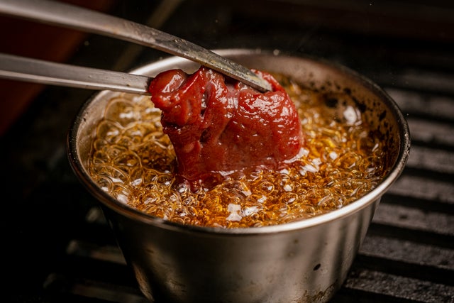 ぐつぐつ煮えているごま油を七輪の上に置き、そのなかで牛レバーをしゃぶしゃぶして召し上がっていただくもの。鮮度に絶対的な自信があるからこそ提供できるメニューです。
