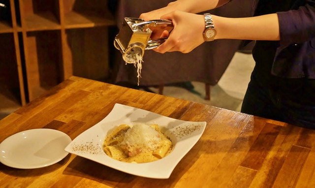 こちらのカルボナーラ、極めつけには、皆様の目の前で "グラナ・パダーノ" というチーズをたっぷりと削りかけます。