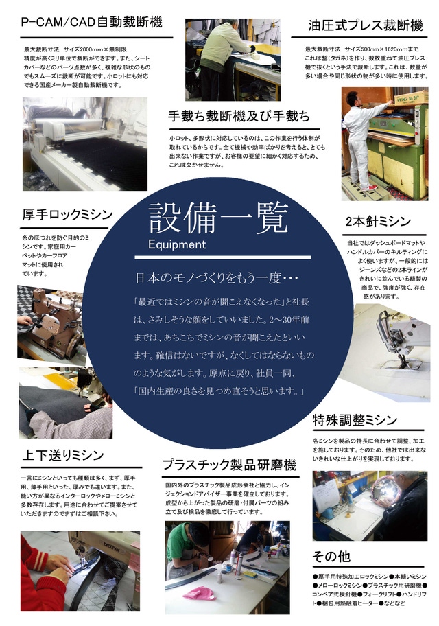 現在はカー用品の縫製のプロとして自社ブランドをはじめ、各販売店様OEM提供、加工業務依頼を行っております。今後もお仕事を通じて皆様との関わりを広め、深めていきたいと考えております。今後ともダイキをよろしくお願いいたします。