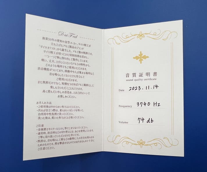 周波数3700~3900Hz、音量70~80dbであることを検査し、一つひとつに音質証明書を付けてお届けします。