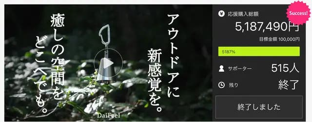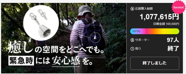 これまで、熊鈴+風鈴の2way仕様のアルミ製熊鈴「DaiFeel」、さらに熊鈴+風鈴+笛の3way仕様になったアルミ製熊鈴「FueFeel」のプロジェクトでは、合わせて612人ものたくさんのサポーターさまの応援をいただきました。