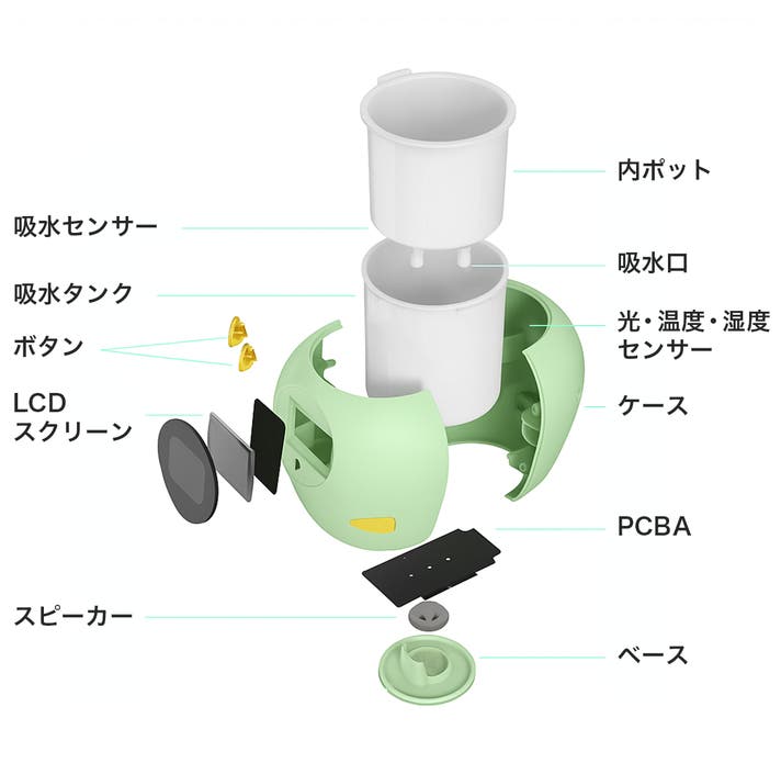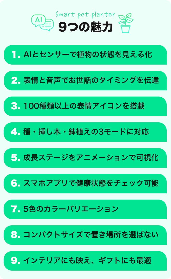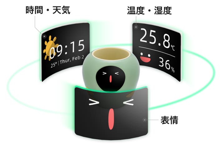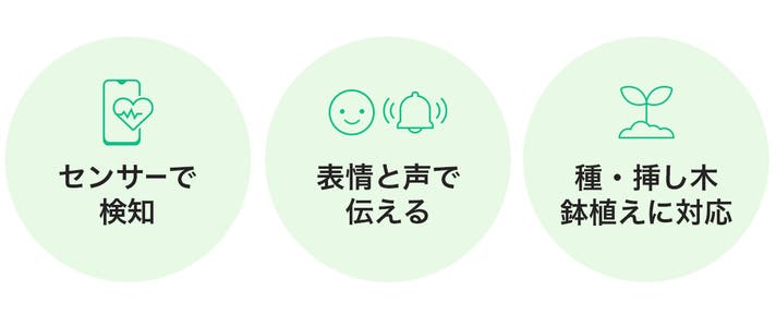 - 水・光・温度をセンサーで検知。表情と声でお世話をお知らせ