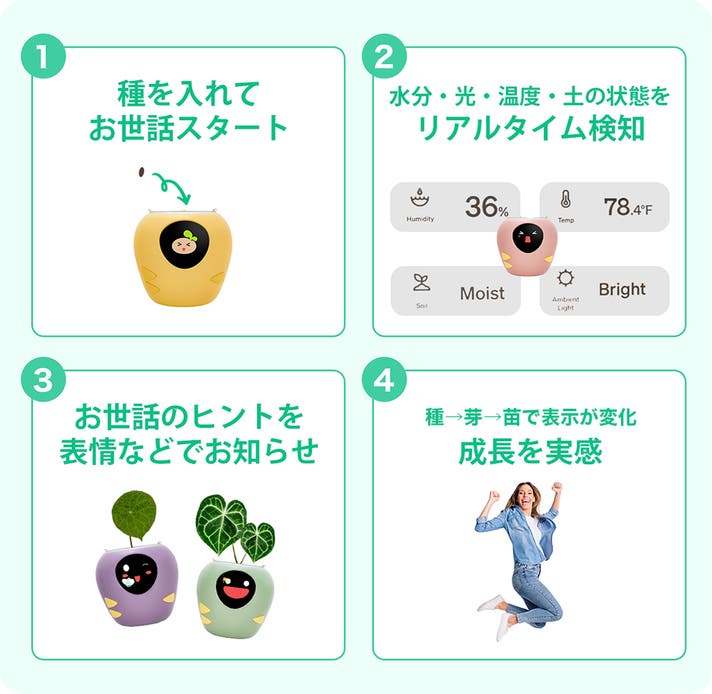 - 種・挿し木・鉢植えに対応。成長をしっかり見守れる機能