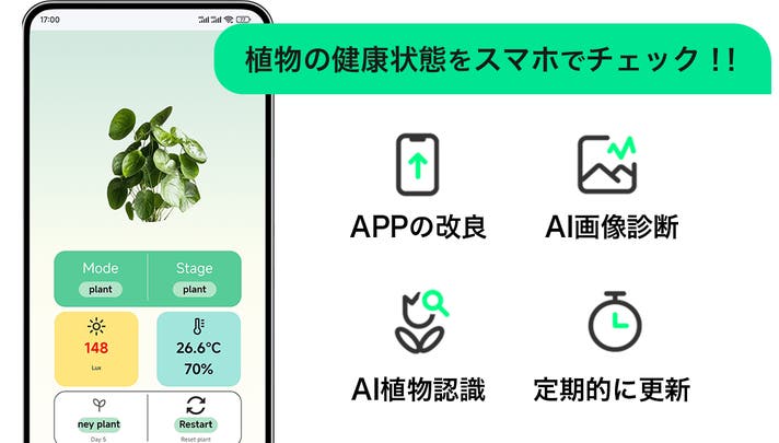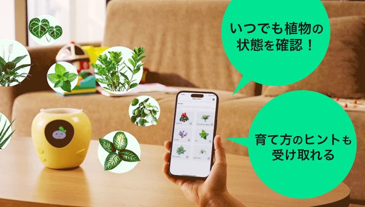 スマホで植物の状態を確認可能。AIが育て方をサポートします。
