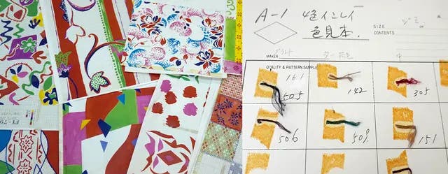 ▲職人が作ったたくさんのパターンと色合わせの糸。何千/何万とできるパターンから生地が決まります。