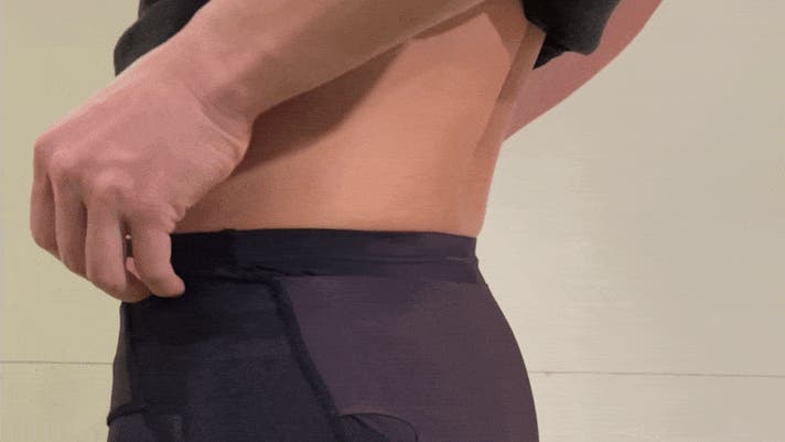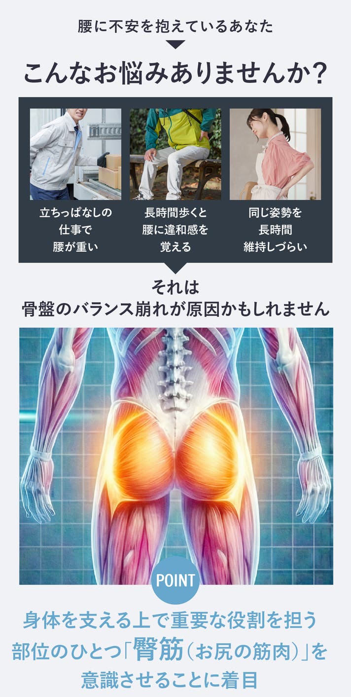 大臀筋の筋繊維に沿った引き上げサポートにより、股関節の可動域が広がることで腰の負担軽減