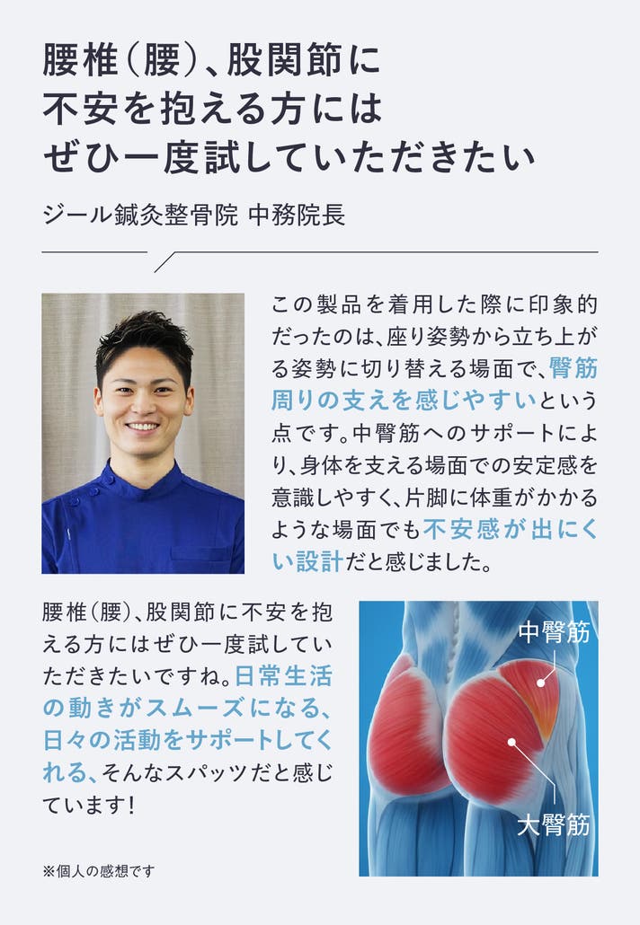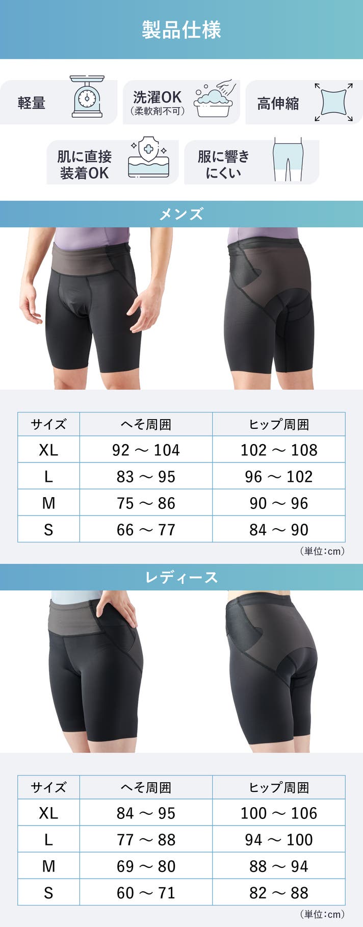 ・本品は、殿筋や骨盤周りのサポートにより股関節の動きをスムーズにすることで、腰への負担を軽減することを目的としたアンダーウェアです。