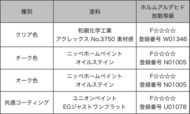 改正建築基準法により、建材のホルムアルデヒド放散の等級表示が義務付けされました。F☆☆☆☆マークはホルムアルデヒド(トルエン・キシレン・ホルマリン等)の放散が少ないことを示しており、使用面積制限なしの等級で、安心できる塗料です。