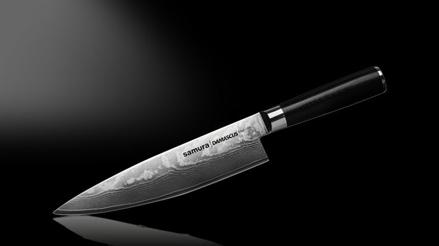 【ダマスカス】のシェフナイフの刃渡りは20cmと、日本の三徳包丁とほぼ同サイズ。