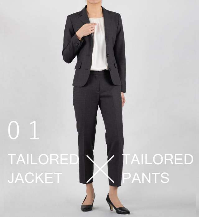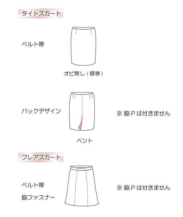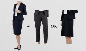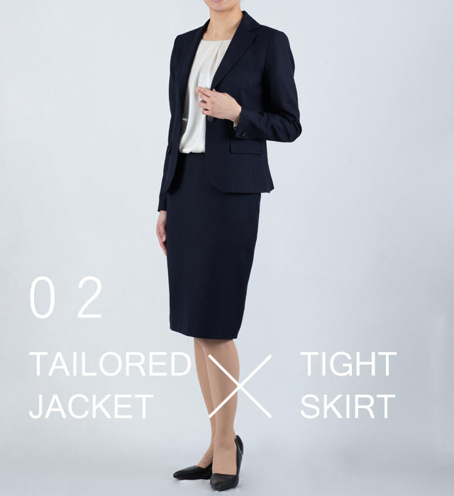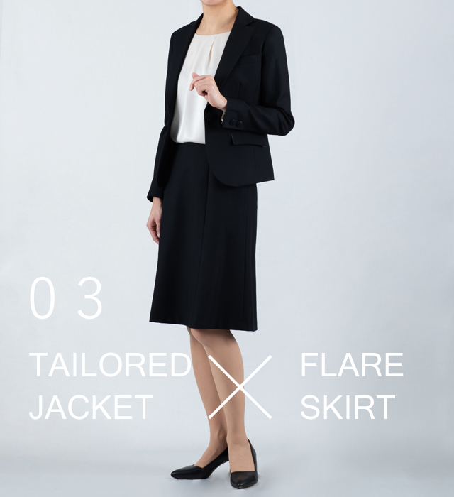 ボトムはテーパードパンツもしくはタイトスカート、フレアスカートからお選びいただけます。