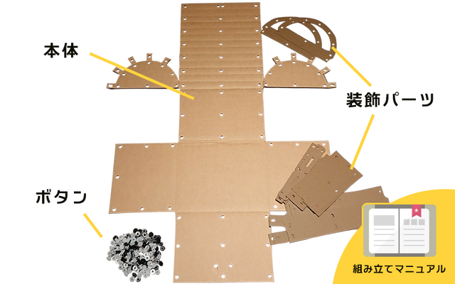 工具や接着剤等は不要です。ダンボールを折り、付属のボタンで留めるだけ。誰でも簡単に組み立てることができます。