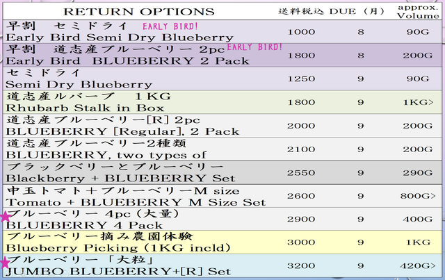 ¥3000 :入園料、1KGが含まれる。(Orchard maintenance fee, 1KG of blueberry included in the fee, Kids under Jr High School included in the fee their guardians paid. )