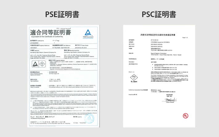 国内認証機関UL JapanでPSCクラス1に合格。また、付属のACアダプターもPSE検査に合格しております。