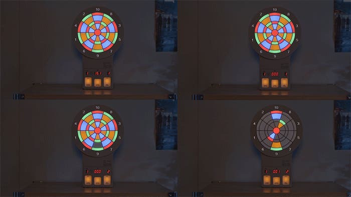 開始スコアは0点。各ラウンドで3回の射撃が可能で、命中エリアの「得点×倍率」に応じてそのラウンドのスコアを獲得します。ただし、同じラウンド内で3回全てが同じ得点にならなければスコアとしてカウントされません。全9ラウンド終了時に、総得点が最も高いプレイヤーが勝者です。