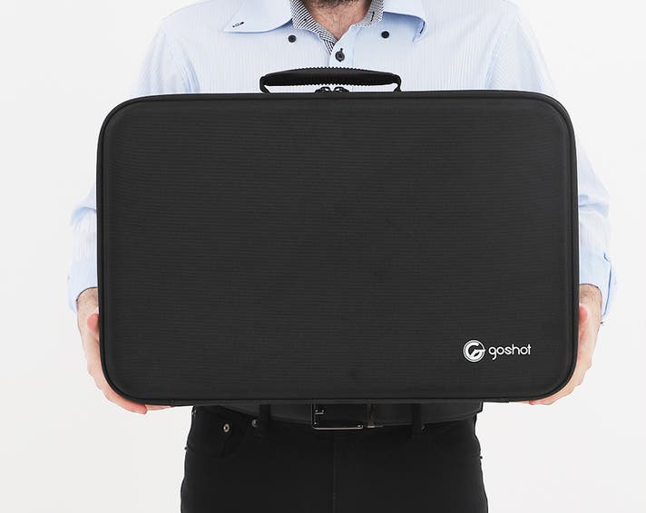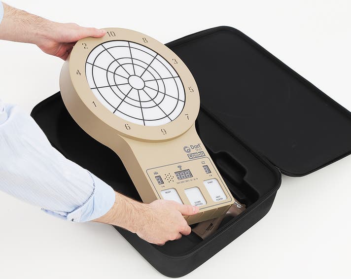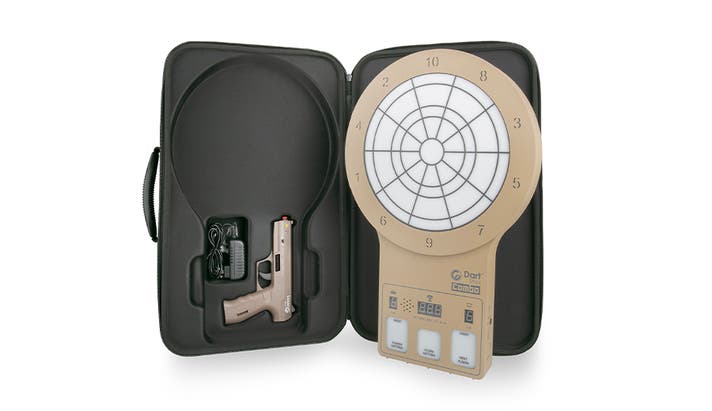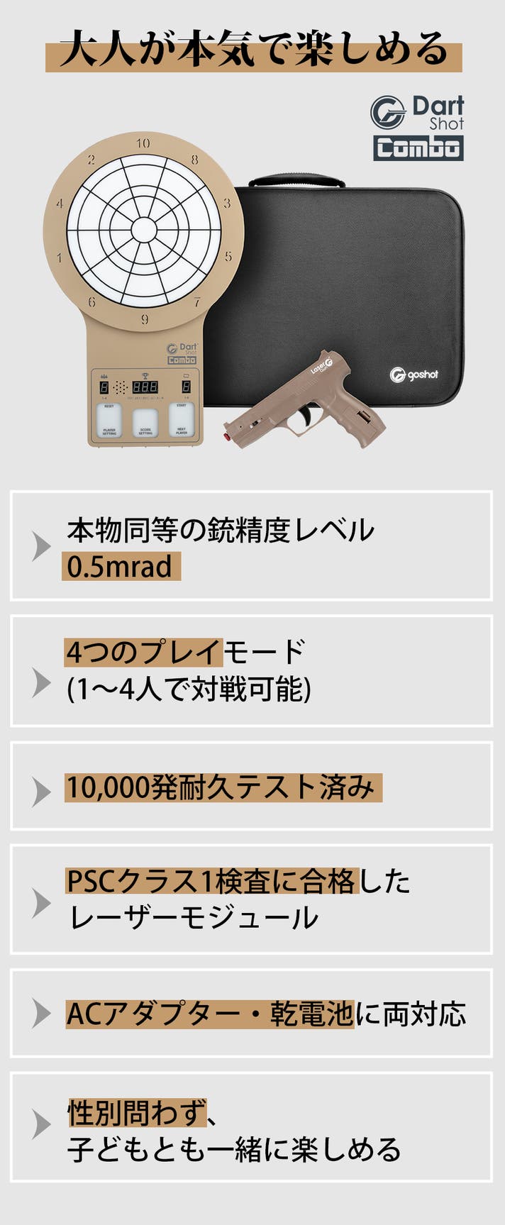 商品構成:DartShot Combo(本体)、LaserGun、ACアダプター(12V、1A、ケーブル長150㎝)、照準調整用六角レンチ、単4電池(試供品)、日本語取扱説明書、DartShot Combo専用ケース