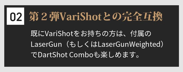 A. パルスを最適化しているので、第1弾DartShot 付属のLaserGun(白)を含め、他のレーザー製品では動作しません。第2弾VariShotとは完全互換性があります。