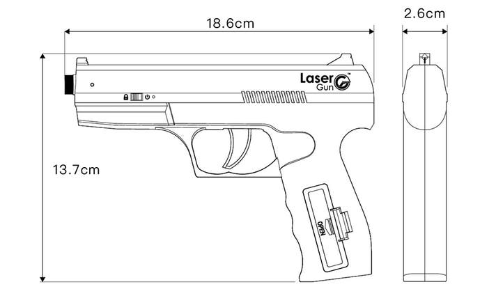 A. LaserGunで採用されたレーザーは基準がクラス1に分類されたレーザー光です。日本ではレーザーの基準がクラス1からクラス4まで有り、クラス1はその中で1番下のクラス、DVD プレイヤー等にも使われるレーザー光です。しかしレーザー光の直視は避け、人には向けないでください。